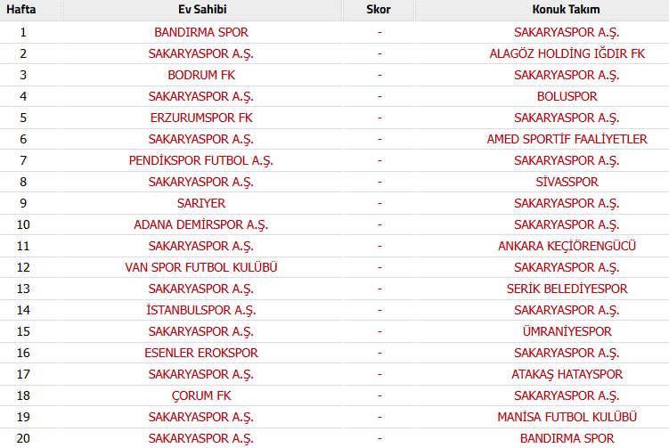 Sakaryaspor Fikstür 2026